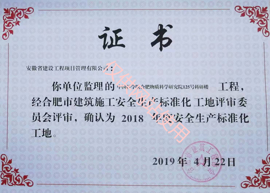 2019年4月,由我公司监理的“中国科学院合肥物质科学研究院125号科研楼工程”经合肥市建筑施工安全生产标准化工地评审委员会评审,确认为“2018年度安全生产标准化工地”。